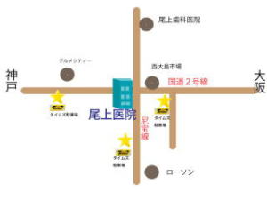国道2号線沿い 尼宝線と国道2号線との交差点 大島交差点 サヌキヤ自転車さん 横が医院です 。 近隣の駐車場にお停めください 、 駐車券ご持参頂ければ駐車料金お支払いします。
